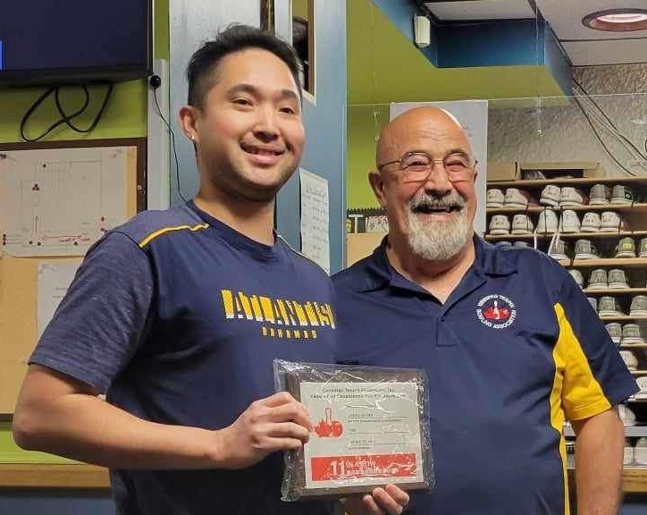 Ron Molinski came out to the lanes to present Lazaro with his 11-in-a-row plaque!