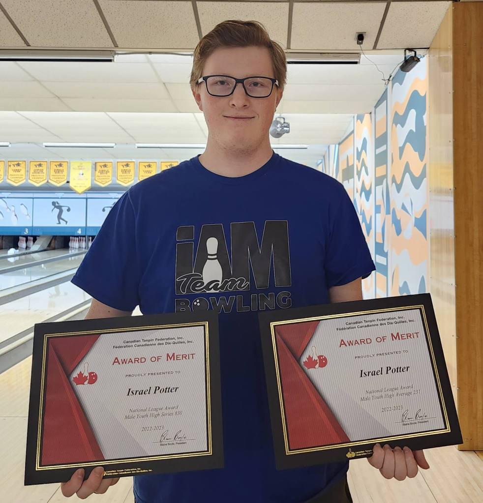 Israel Potter, one of our local youth bowlers, was presented with two 2022-23 National awards. One was for having that season’s highest Male Youth Average in the country, which was a whopping 231 ! And the other was for having the season’s highest Male Youth Series in Canada – an 830 !!